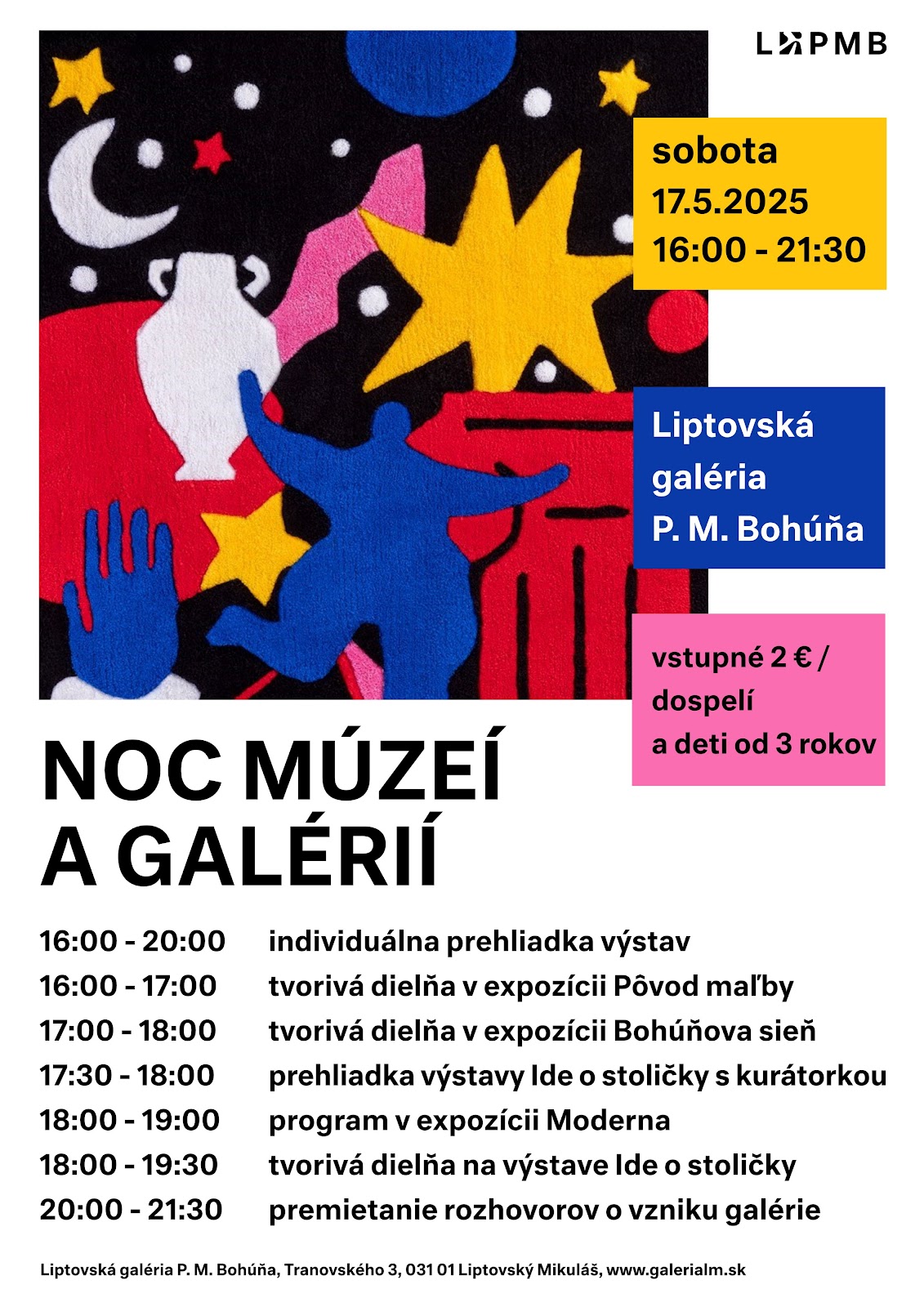 16:00 - 20:00 individuálna prehliadka výstav, 16:00 - 17:00 tvorivá dielňa v expozícii Pôvod maľby, 17:00 - 18:00 tvorivá dielňa v expozícii Bohúňova sieň, 17:30 - 18:00 prehliadka výstavy Ide o stoličky s kurátorkou J. Babušiakovou, 18:00 - 19:00 program v expozícii Moderna, 18:00 - 19:30 tvorivá dielňa na výstave Ide o stoličky, 20:00 - 21:30 premietanie rozhovoru súčasného riaditeľa galérie R. Gregora s bývalým riaditeľom K. Maliňákom o vzniku Liptovskej galérie P. M. Bohúňa.
