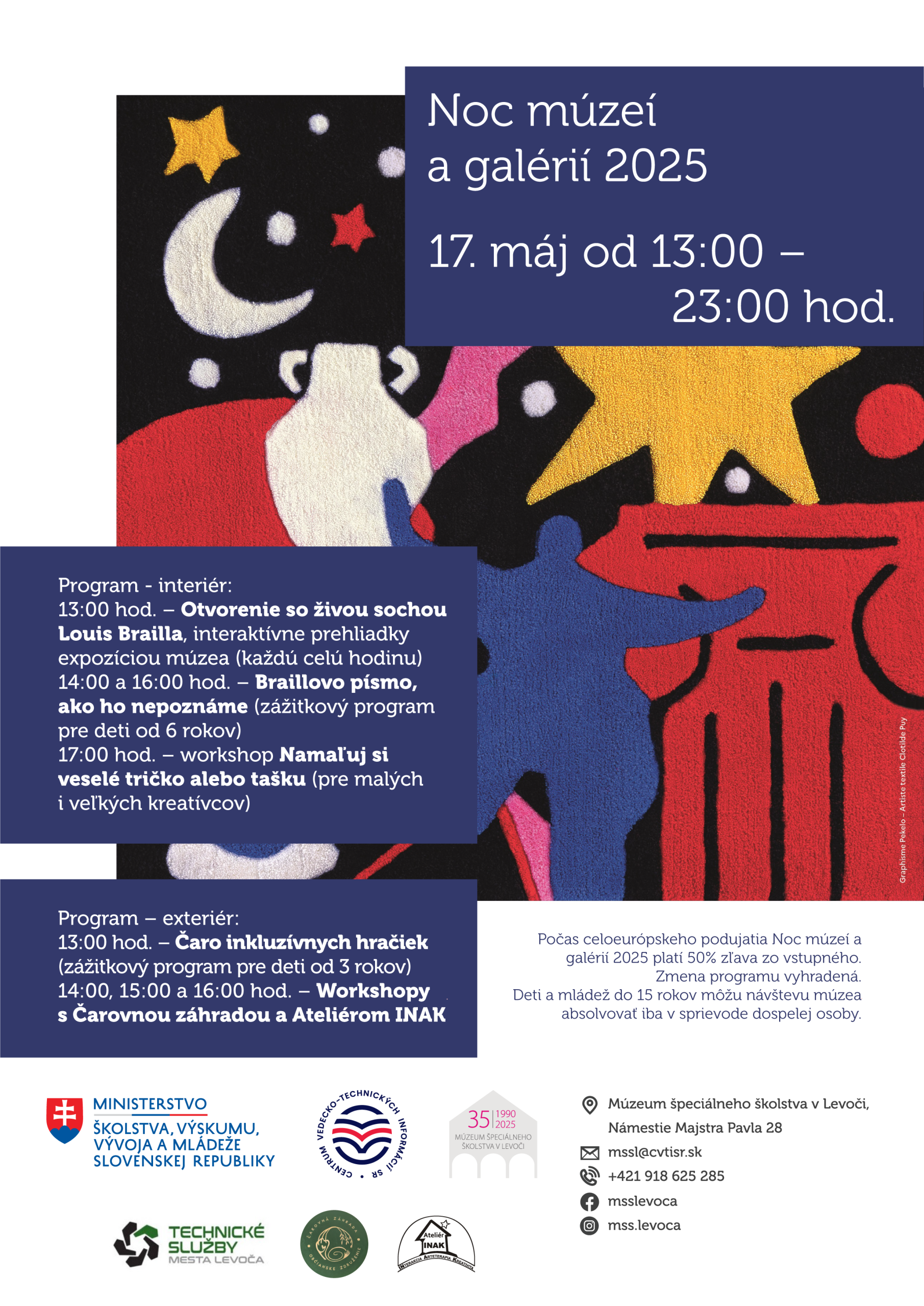 Program levočskej Noci múzeí a galérií 2025 v interaktívnom Múzeu špeciálneho školstva odštartujeme o 13-tej hodine slávnostným gongom pred budovou múzea a za prítomnosti živej sochy Louisa Brailla, autora Braillovej abecedy, velikána dejín vzdelávania nevidiacich v Európe.