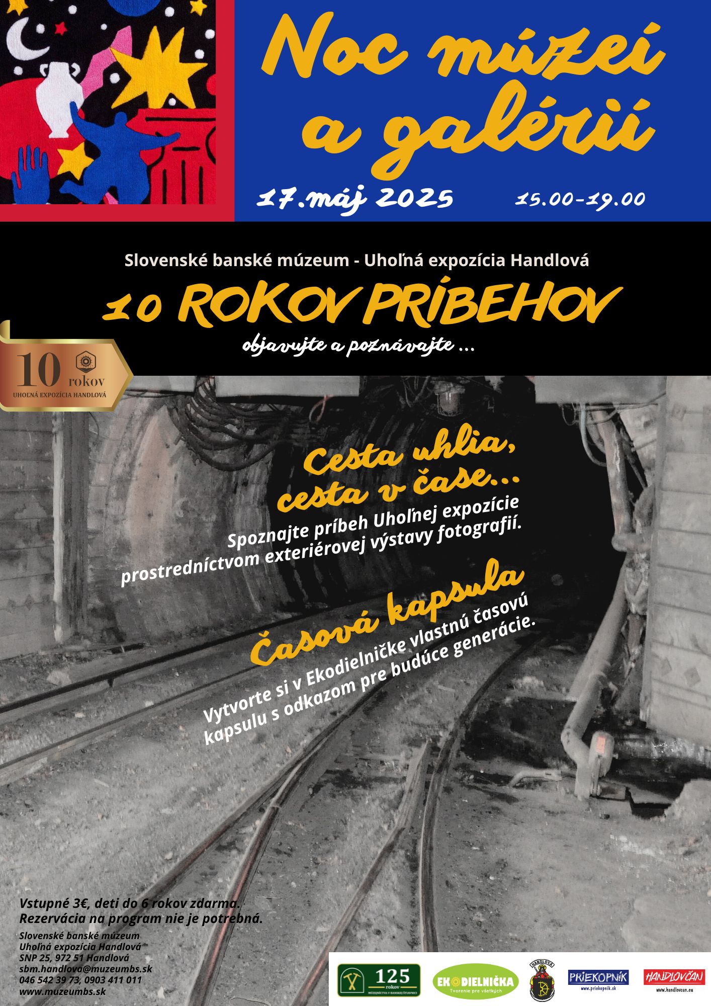 Zaujímavý program pre Noc múzeí a galérií bude pripravený aj v Uhoľnej expozícii v Handlovej. Pozrieť si môžete exteriérovú výstavu fotografií „Cesta uhlia, cesta v čase...“, ktorá opisuje históriu a vývoj expozície. V Ekodielničke si návštevníci budú môcť vytvoriť vlastné časové kapsuly, navrhnú si ich obal a určia, kedy sa kapsula otvorí. Aktivita sa uskutoční 17. mája 2025 v čase od 15.00 do 19.00 hod.