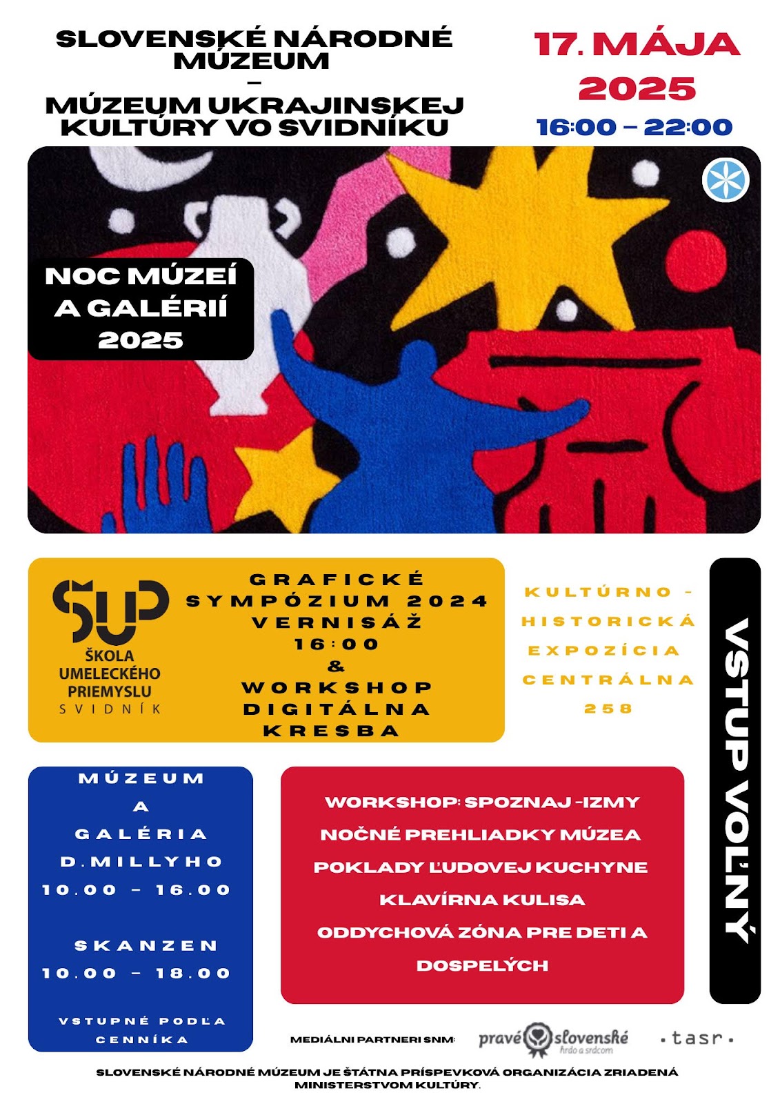 16.00 Grafické sympózium 2024 - slávnostná vernisáž výstavy v spolupráci so Školou umeleckého priemyslu Svidník 16.00 - 22.00 Workshopy: Digitálna kresba, Spoznaj -izmy, Poklady ľudovej kuchyne, nočné prehliadky múzea, klavírna kulisa, oddychová zóna pre deti a dospelých. Voľný vstup na podujatie.