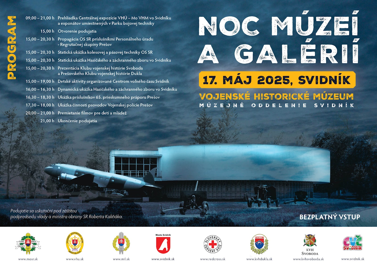 Vojenský historický ústav („VHÚ“) sa pod záštitou podpredsedu vlády a ministra obrany Slovenskej republiky, dňa 17. mája 2025, zapojí do 21. ročníka celoeurópskeho podujatia Noc múzeí a galérií 2025. Pri tejto príležitosti aj Vojenské historické múzeum (ďalej len „VHM“) otvorí svoje brány a sprístupní tak všetky svoje expozície.